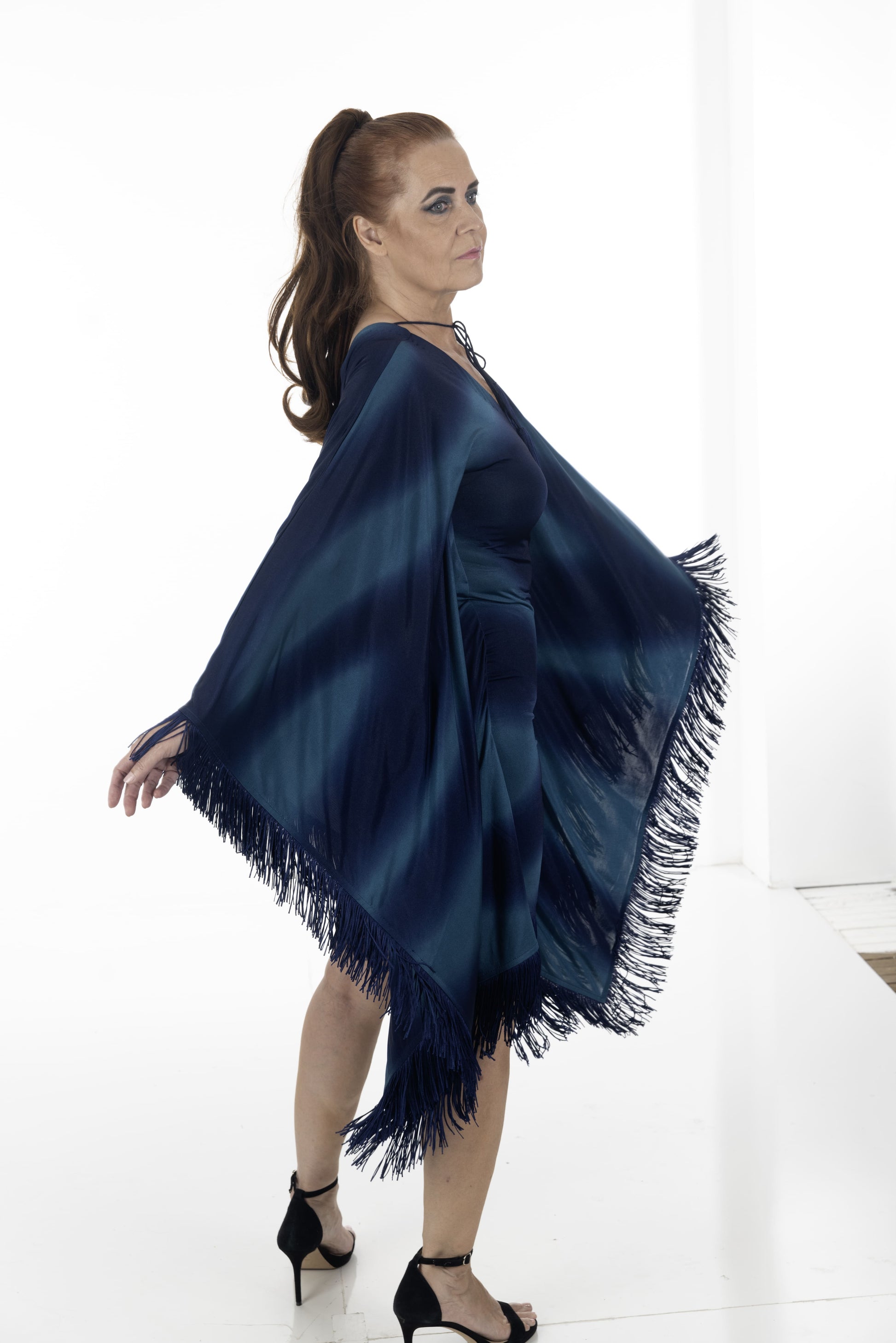 The Midnight Waves Fringe Dress captures the mystique of the sea with its deep blue tones, fluid silhouette, and long cascading fringe trim. The wide, flowing sleeves create a dramatic presence, while the shorter hemline adds a playful balance, making this piece both elegant and daring.